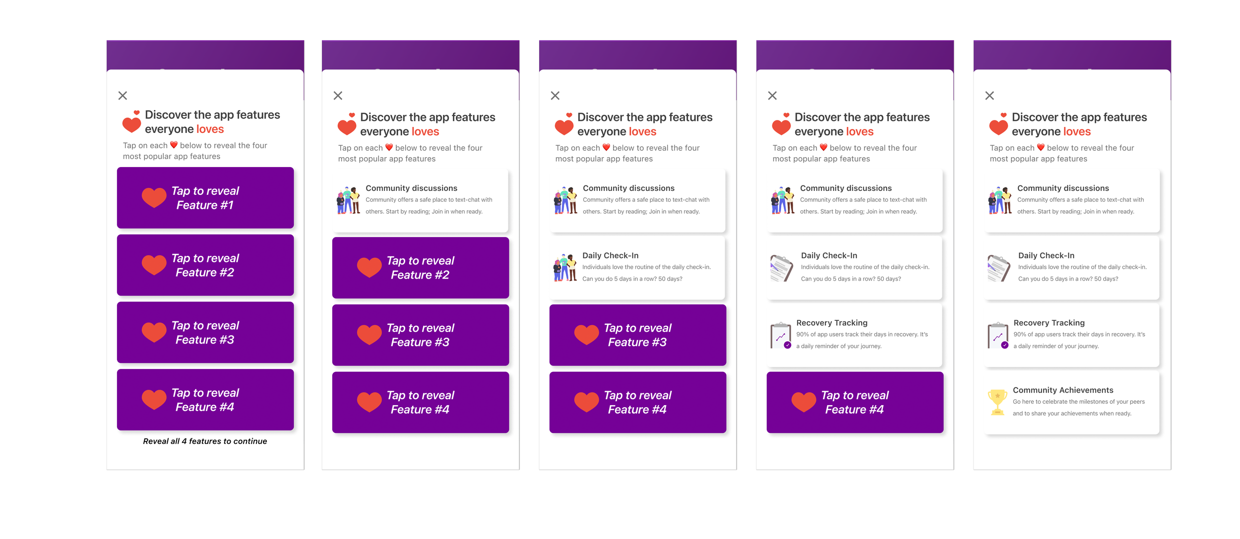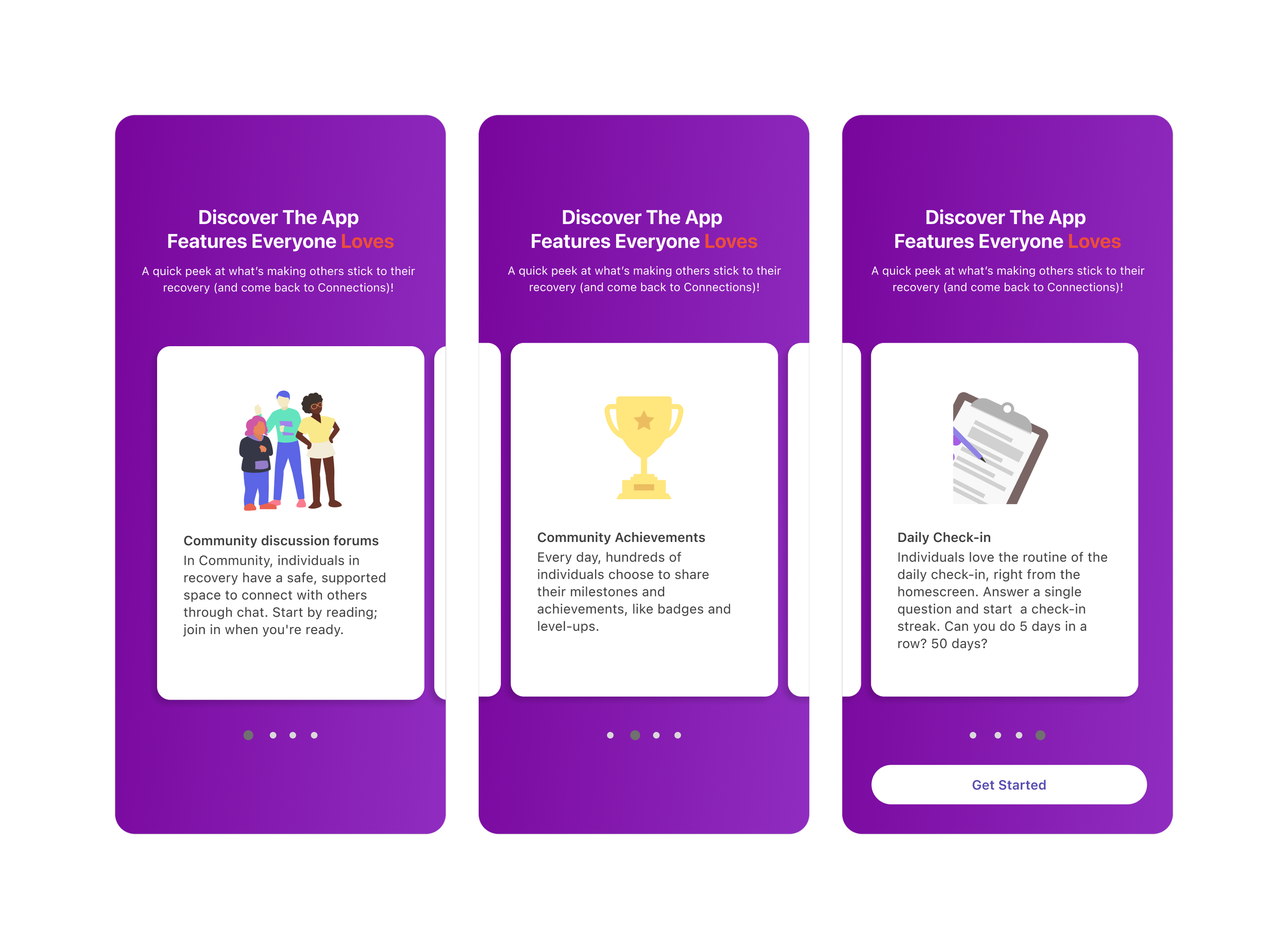 The Connections onboarding redesign addressed critical user retention where 80% of new users abandoned the sobriety support app after first login. The goal was to guide patients from registration to an active community through interactive walkthroughs and as well as add the app's first motion designs along with implementing a new visual design language.